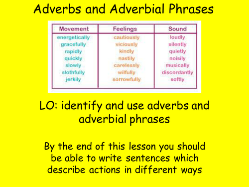 Adverbs - Presentation English Language from www.sliderbase.com Adverbs of manner, place and time usually come in end position: Adverbial phrases modify other words by explaining why, how, where, or when an action occurred. An adverb or adverbial phrase is one or more words that change the verb in a sentence. An adverb phrase or adverb (adverbial) clause gives us information about the verb such as how, when, where, and how often something happens. We can put adverbs and adverb phrases at the front, in the middle or at the end of a clause. An adverbial phrase is a group of words used in the same way as an adverb to add further information or detail to a verb, adjective, another adverb, or even whole clauses. It may be expressed in almost all the ways enumerated in § 97. Tomorrow afternoon, i'm going to the free cities.