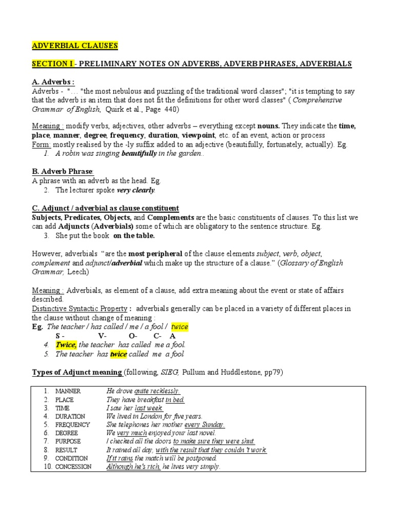 That is, it modifies a verb adverbial phrases typically give descriptions of time, location, manner, or reason. Adverbial phrases of frequency describe how often something happens. In these adverbial phrases that tell us for how long, for is always. It may be expressed in almost all the ways enumerated in § 97. Yesterday, a year ago, on monday, etc, are usually the last in the sentence, after the other adverbs (mode and place).